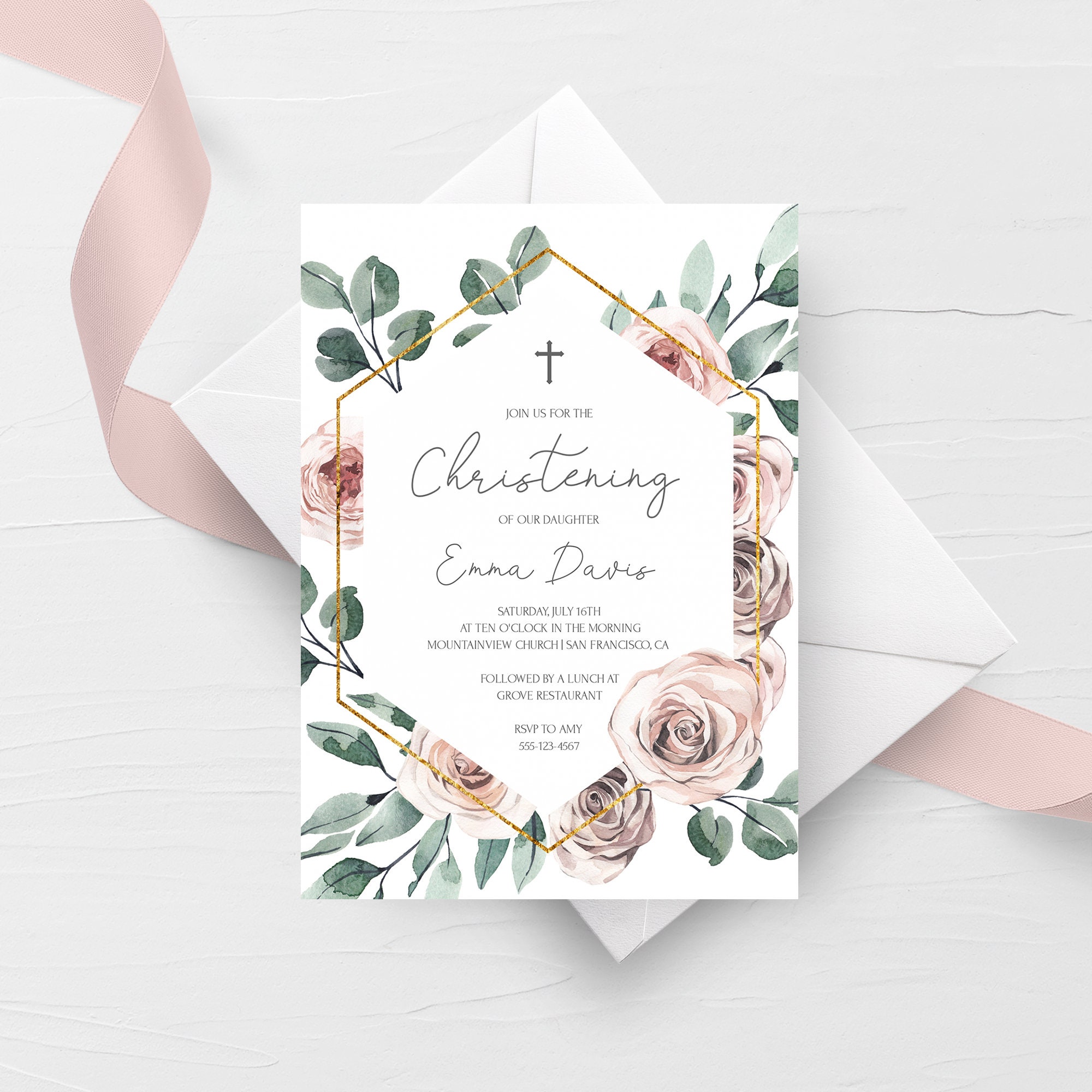 Boho Rose Christening Invitation Template Printable Girl Etsy